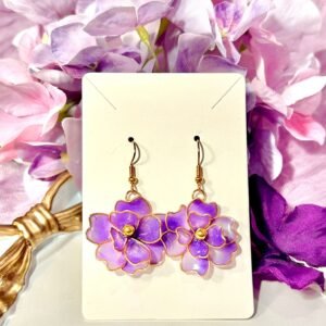 Each Lavender Bloom earring begins as a single length of gold-tone wire that I hand-form into a five-petal blossom, then dip times in crystal-clear resin tinted with a dreamy purple gradient. A dusting of iridescent shimmer catches the light, while a gleaming gold bead anchors the center—so the petals glow like real morning dew.