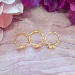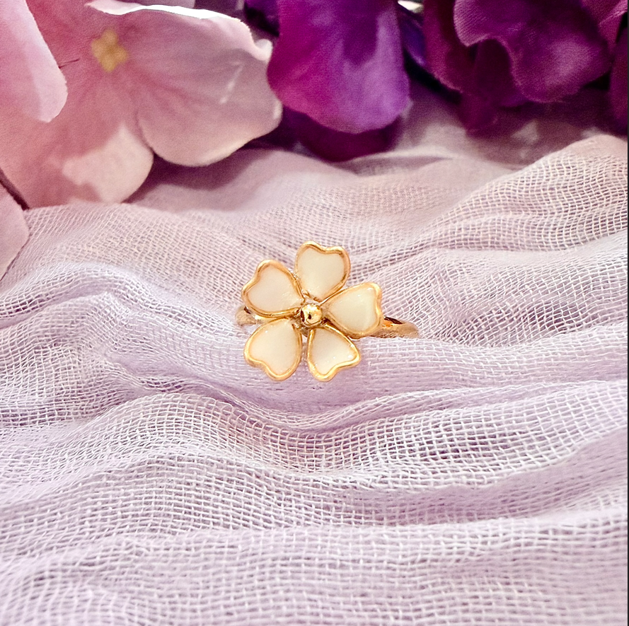 Inspired by the fleeting beauty of cherry blossoms, the Sakura Ring features five delicately sculpted, heart-shaped petals that echo the soft elegance of a blooming sakura. Each resin ring is handmade and set on an 18k gold-plated, tarnish-resistant band, with an 18k gold filled bead that adds warmth and balance. Lightweight and timeless, it’s designed for effortless everyday wear or special moments.